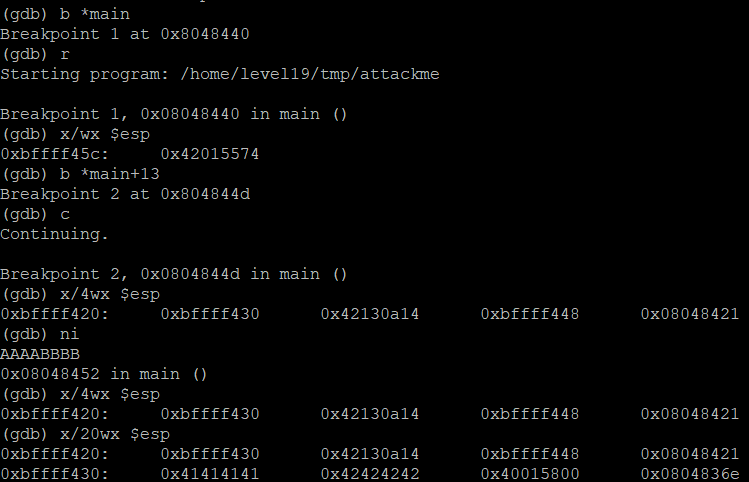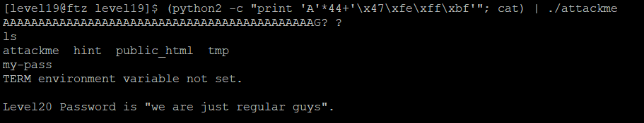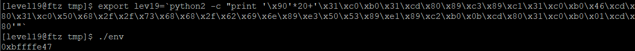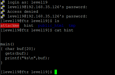 level19로 로그인한 후 hint를 확인해보면 소스코드가 나온다. 전 단계에서 많은 양의 코드를 보여줬기에 19 level은 더 많거나 복잡할 줄 알았지만 예상보다 간단했다. 소스코드도 작고 대놓고 gets 함수가 보여서 bof가 일어남을 알 수 있다. 공격은 gets를 통해 overflow를 일으켜 ret를 쉘 코드가 들어간 환경변수의 주소로 변조하면 될 것 같다.