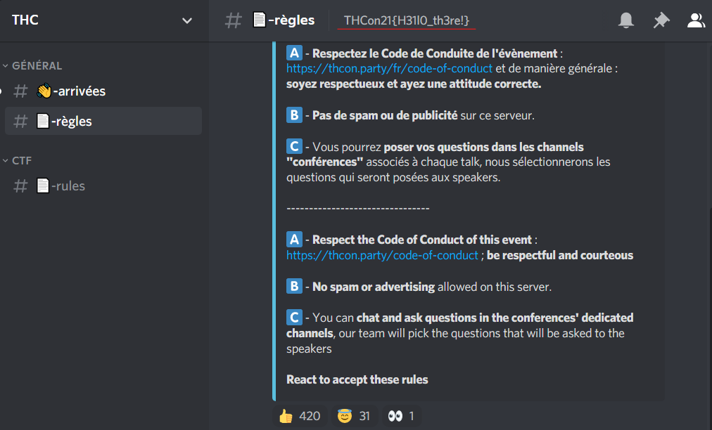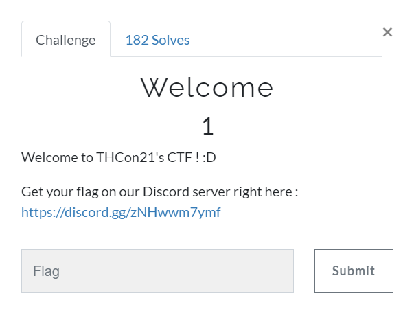 ThcCTF 2021의 Welcome 문제다. 이 문제는 설명에 나와 있는 discord 서버에 들어가기만 해도 flag를 준다.