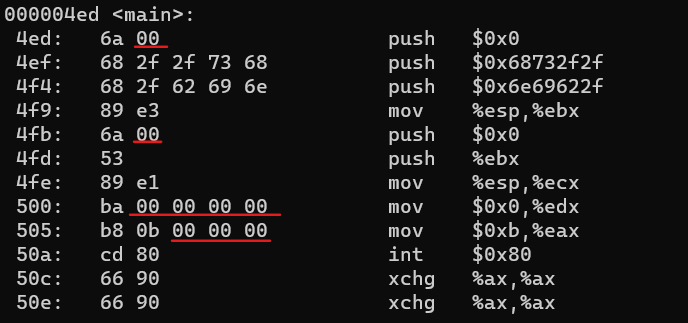 push $0x0 대신 xor 명령어로 eax 레지스터를 0x00으로 초기화시킨 뒤 스택에 push하여 0x00을 없앴다.