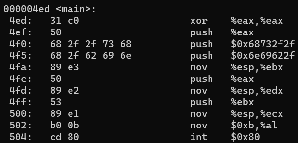 objdump로 열어보면 opcode에 0x00이 포함되지 않은 것을 알 수 있다. 이제 이 opcode들을 \x와 함께 연결한다면 shellcode가 완성된다.