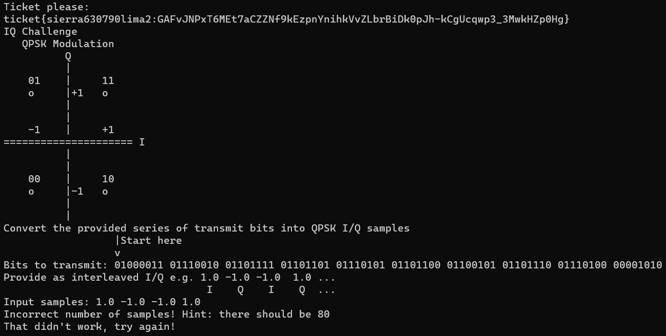 수작업으로 조금 변환한 뒤 입력하니 틀린 값이라 출력되고, hint 값으로 답의 길이가 80이라는 내용의 문구를 출력해줬다. 주어진 2진 bit가 모두 20개이므로 20*4=80, 즉 모든 2진 bit를 I/Q Sample로 바꿔준다면 길이가 80이 된다.