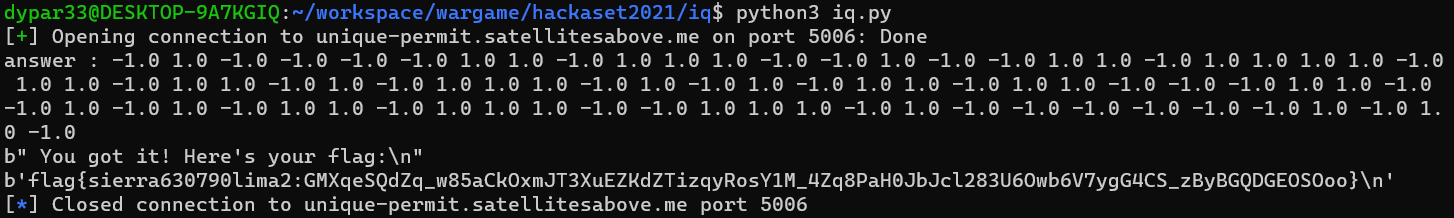 수작업으로 하기에는 너무 많기 때문에 자동화 코드를 짰다. 01은 -1.0 1.0, 10은 1.0 -1.0, 11은 1.0 1.0, 00은 -1.0 -1.0으로 바꿔주도록 하고, 결과 값들을 모두 합쳐 전송했다. 처음에는 결과 값 끝에 공백을 하나 넣었는데, 이렇게 전송하니 flag를 획득할 수 없었다.