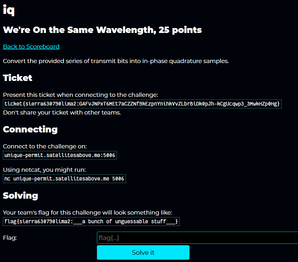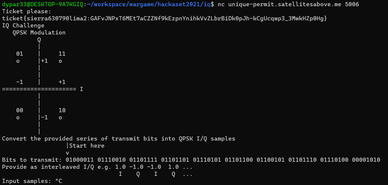 nc로 대회 서버에 접속하면 다음과 같은 문구들이 출력된다. QPSK Modulation이라는 문구와 함께 IQ(?) 좌표가 출력되고 0100011 같은 2진 숫자 들을 I/Q Sample로 변환하라고 하면서 입력을 받는다.