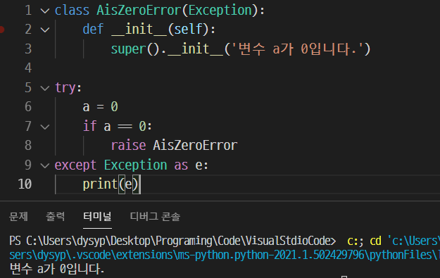 그리고 try, except 예외처리문을 통해 AisZeroError를 발생시키니, except에서 AisZeroError의 에러 문구가 출력되는 것을 볼 수 있다.