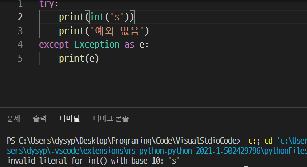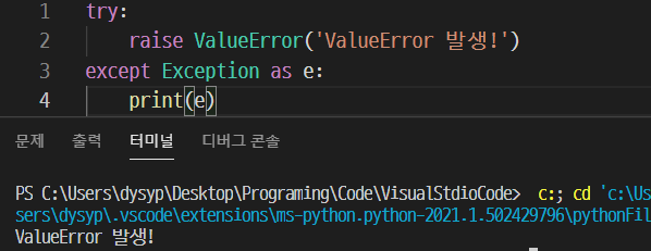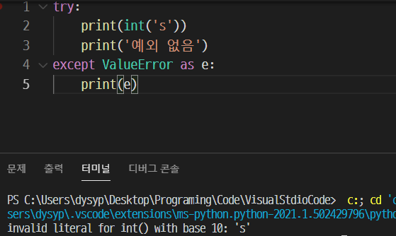 위처럼 as e로 ValueError의 에러문구를 받아와서 출력하는 것을 볼 수 있다. 이 as 뒤에는 원하는 변수명을 써주면 되는데, 보통 exception의 e를 따서 as 뒤의 변수명을 e로 짓는다고 한다.