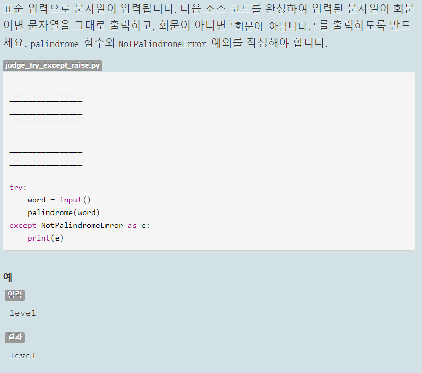 먼저 Exception을 상속받는 NotPalindromeError 클래스를 작성하고 __init__ 메서드에서 super().__init__를 사용해 에러 문구를 '회문이 아닙니다.'로 지정해줬다. 그다음 입력 값 word를 매개변수로 받는 palindrome 함수를 작성하고 입력 값을 리스트로 형 변환 시킨 list(word)와 입력 값을 거꾸로 한 후 리스트로 형 변환 시킨 list(reversed(word))를 비교해서 만약 같지 않다면 NotPalindromeError를 발생시키게 했다. 아닐 경우 단어가 그대로 출력된다.