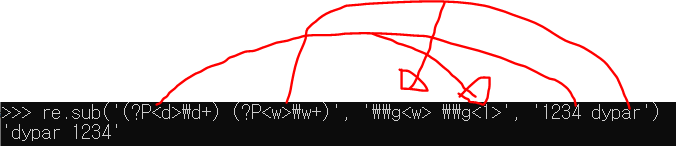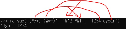 위는 찾은 결과를 \\2, \\1로 바꿀 문자열에 넣어서 공백을 기준으로 '1234 dypar'를 순서를 바꿔서 출력한 모습이다.