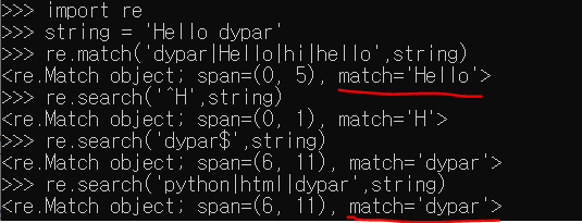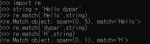 이상하게도 'dypar'를 패턴으로 입력했을 때는 값이 반환되지 않는데, 아직 이유를 모르겠다. -> 이유는 match는 문자열 처음부터 매칭되는지 판단하기 때문에, 첫 문자가 'd'가 아니라면 패턴이 존재하지 않는 것으로 처리하는 것이다.