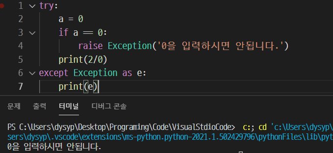 위처럼 raise를 써주니 의도적으로 예외를 발생시킬 수 있고, 또한 예외 문구도 정할 수 있는 것을 볼 수 있다.