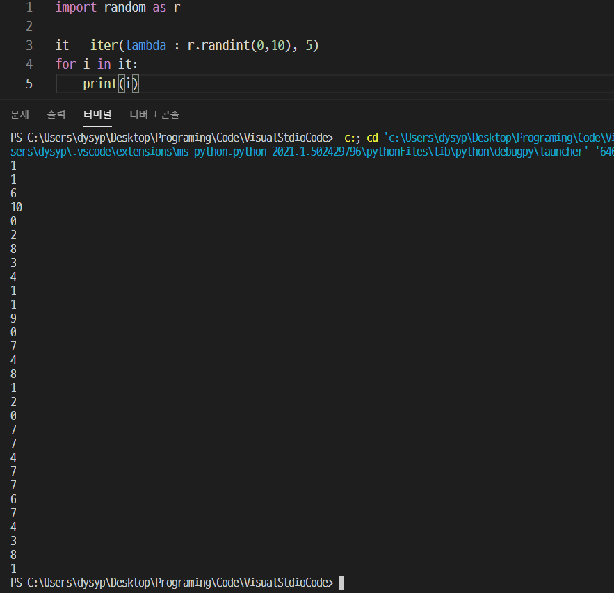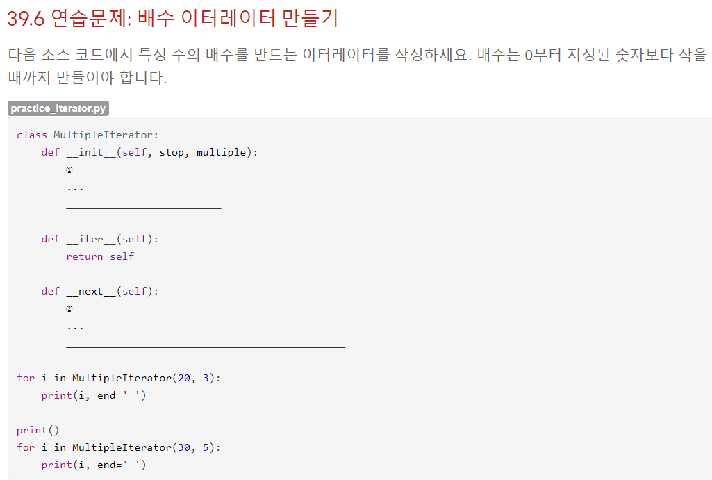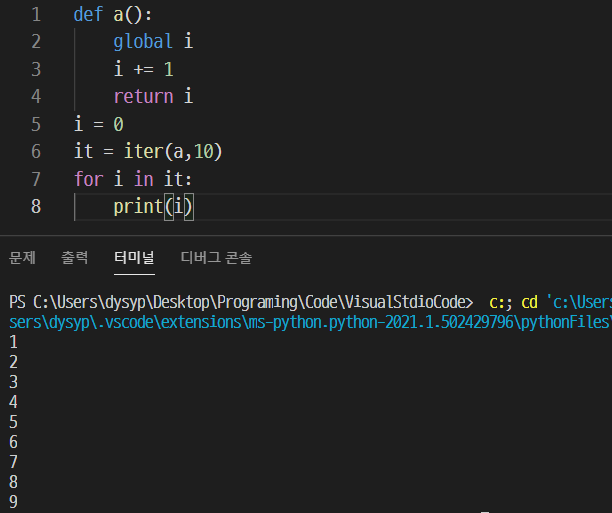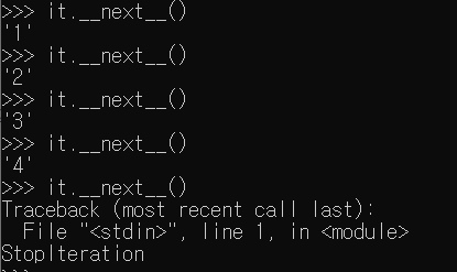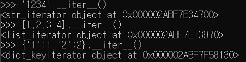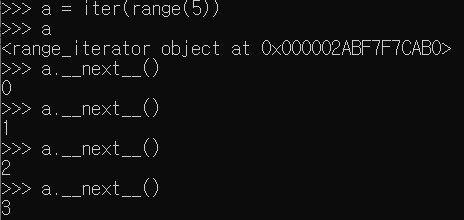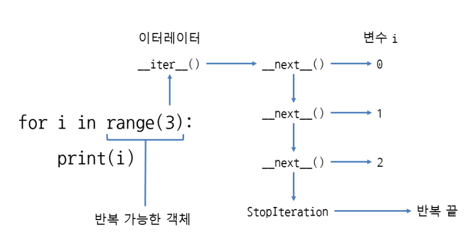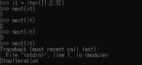 for 문으로 특정 횟수만큼 반복시킬 때, 사용했던 것이 바로 range였는데, 사실 이 range는 iterator를 만들어 주는 역할을 했다. 예를들어 range(1,100)을 쓰면 1~99까지의 숫자가 만들어지는게 아닌, 1~99까지의 숫자를 차례대로 꺼낼 수 있는 iterator 객체 하나만 만들어지는 것이다. 이 iterator를 반복자라고 부른다.