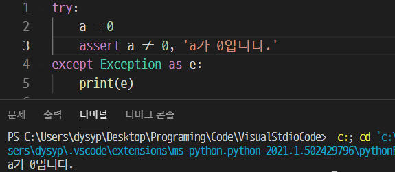 assert는 참일 경우 넘어가고 거짓일 경우 예외를 발생시키므로, ==이 아닌 !=을 주어 a가 0일 경우 예외가 발생하도록 작성했다. 에러 문구는 'a가 0입니다.'를 넣어줬다.