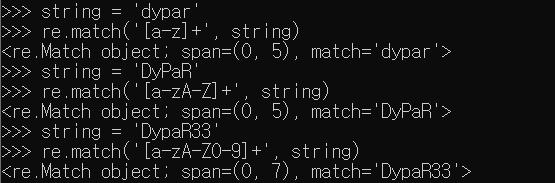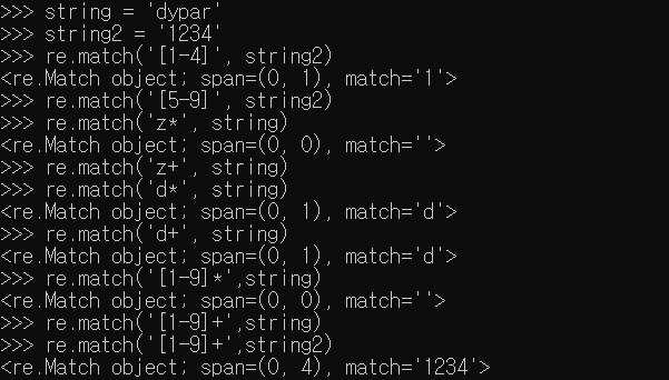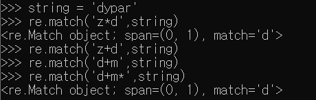 'dypar' 문자열을 담고 있는 string을 'z*d'를 패턴으로 확인한다면 z는 0개 이상, d는 1개가 있어야지 SRE_Match 객체를 반환해 준다. z+d 패턴일 경우 z 1개 이상, d 1개 있어야지 SRE_Match 객체를 반환해준다. d+m* 패턴의 경우 d 1개 이상, m은 0개 이상 있으면 SRE_Match 객체를 반환해 준다.
