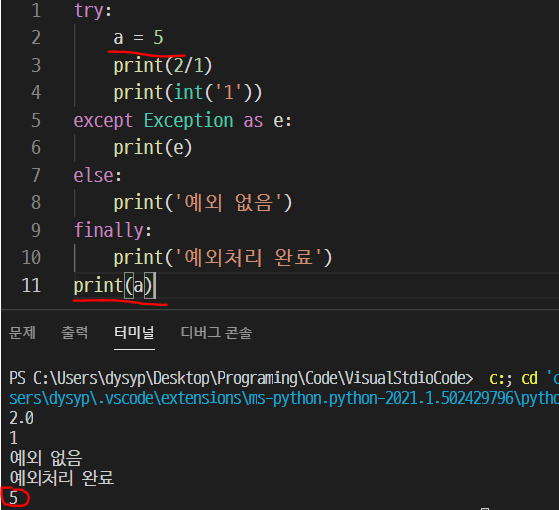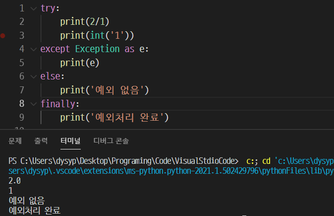 위 사진처럼 try의 코드에 예외가 발생하지 않도록 작성하니, try의 코드를 실행한 후, else의 코드를 실행하는 것을 알 수 있다.