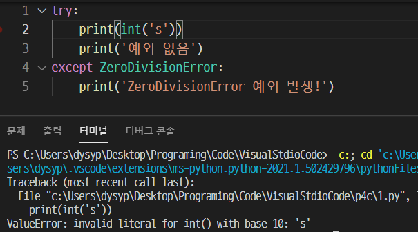 반대로 ZeroDivisionError를 except에 지정한 상태에서 ValueError를 주니 except 코드가 실행되지 않고, 에러를 발생시키는 것을 볼 수 있다.
