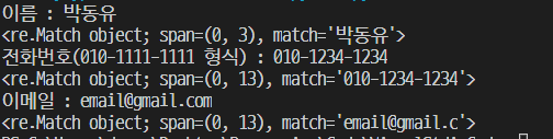 배운 것을 응용해서 만들어본 이름, 전화번호, 이메일 형식 확인 기능을 하는 코드다. 여기다 조건식만 추가해서, 형식 여부를 확인하면 완벽해질 것 같다.