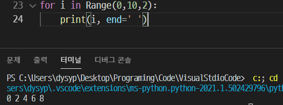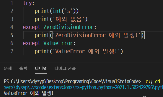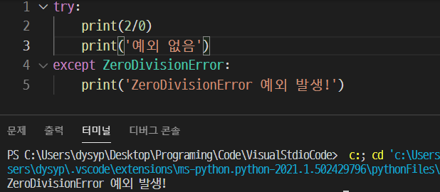 ZeroDivisionError가 일어났던 계산식인 2/0을 print 하도록 하고 그다음 '예외 없음'을 출력해주는 print문을 적었다. 결과를 보면 2/0 결과 값과 '예외 없음'이라는 문구는 출력되지 않고, '예외 발생'만 출력됐다. 이 2/0을 연산할 때 예외가 발생하자마자 try의 나머지 코드들을 실행하지 않고, 바로 except의 코드만 실행하는 것이다.