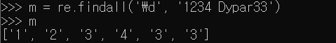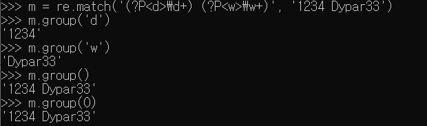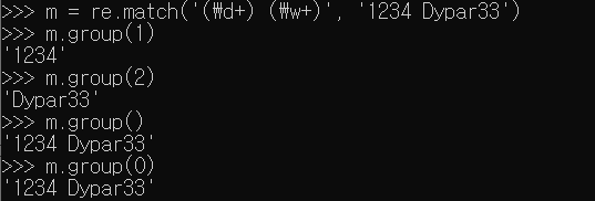 '1234 Dypar33'을 \d+와 \w+로 각각 매칭을 판단했다. \d+는 1234를 판단했기에 1234 그대로 저장, \w는 Dypar33을 판단했기에 Dypar33 그대로 저장한다. \d는 그룹 1, \w는 그룹 2에 저장하는데, 이를 group 함수로 숫자를 지정해서 해당 결과를 반환할 수 있다. 또한 group 괄호 안에 아무것도 안넣거나 0을 넣어주면 그룹 전부를 출력해준다.