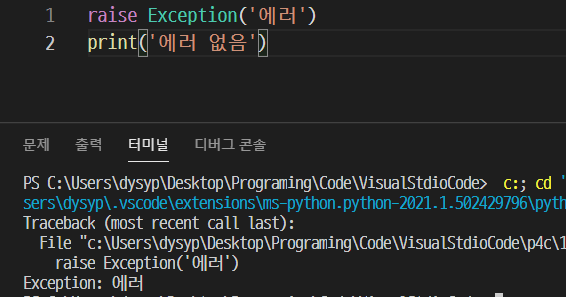 이 raise는 꼭 try 코드 내에서만 사용하는 것이 아니다. 실습 결과 try, except 같은 예외처리가 없는 경우에는, 아래 사진처럼 그냥 프로그램을 중단하고 에러 문구를 보여준다.