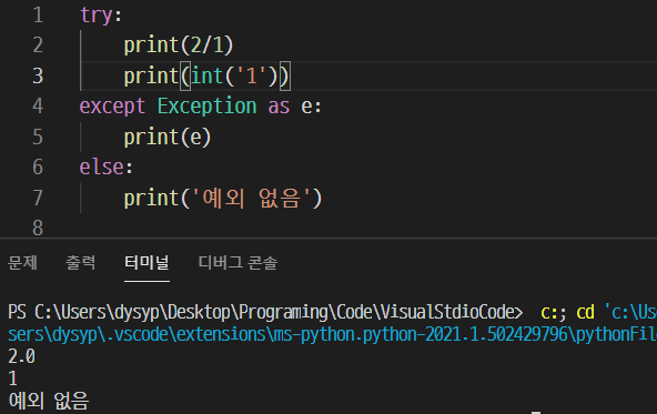 당연하지만 2/0을 예외를 발생하지 않는 식(2/2 같은)으로 바꿔준다면 except 코드는 실행되지 않고, 대신 '예외 없음'이 출력된다.