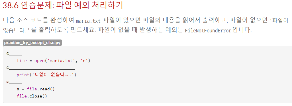 만약 예외가 없다면 파일을 읽어서 내용을 출력하는 것이 목적이므로, 예외가 없을 때 실행되는 else를 써줬다.