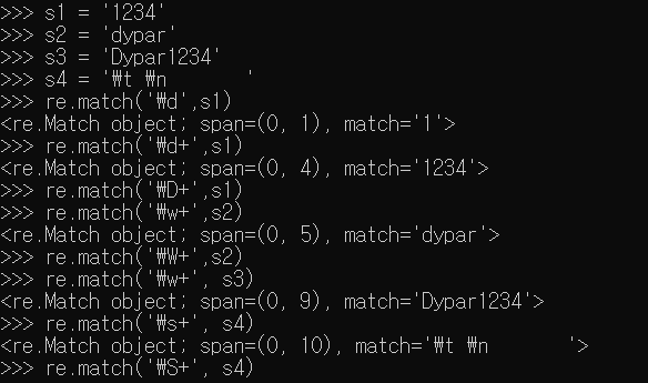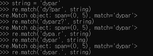 ?는 해당 문자가 0개 또는 1개인지 판단해주는 것을 볼 수 있다. .은 해당 위치에 문자가 존재하는지 판단하는데 'dypar'의 경우 'dy.ar'은 SRE_Match 객체를 반환해주지만, 'dypar.'이나 'dyp.ar'의 경우 반환을 안해주는 것을 볼 수 있다.