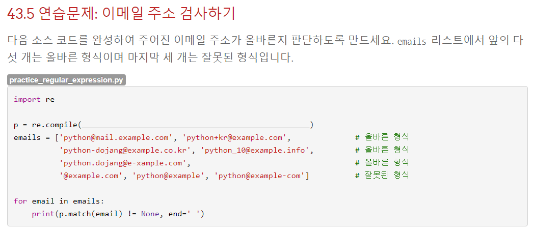주어진 이메일 주소가 올바른지 판단하도록 패턴을 짜는 것이 목적이다. 이메일들을 보면 대충 규칙이 (영어, 숫자, _, -, . +)@(영어, -).(영어,-,.]으로 되어 있는 것을 볼 수 있다. 이를 이용해 정규 표현식을 짜면 된다.