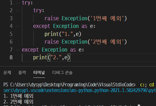 위 사진처럼 중첩 예외처리, 중첩 예외 발생 또한 가능하다. 1행의 try 안, 2행의 try에서 발생하는 예외는 4행의 except 코드를 실행시키고, 4행의 except 코드 안의 예외 발생은 7행의 except 코드를 실행 시킨다.