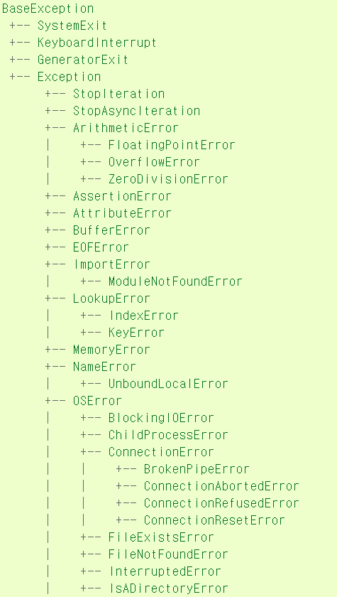 위는 파이썬 홈페이지에 나와있는 Exception 계층도의 일부다.