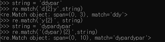 {<개수>}로 지정해주면 해당 개수 만큼 존재할 시 SRE_Match 객체를 반환하는 것을 볼 수 있다. 또한 문자열도 가능한데 이 경우 문자열 전체를 ( )로 묶어주고 {<개수>}를 써줘야한다.