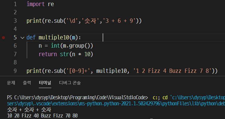 5~9행은 코딩도장의 예제 코드다. multiple10 함수가 매개변수로 매치 객체를 받는다고 하는데, 이부분은 완벽히 이해는 못한 것 같다. 내가 이해한 바로는 [0-9]에 해당하는 문자를 '1 2 Fizz 4 Buzz Fizz 7 8'에서 찾고, 하나를 찾을 때마다 그것을 인자로 multiple10에 넘겨주고, group으로 값을 빼낸 후 int 형으로 만들어 10을 곱해준 값을 문자열로 리턴해 그 값으로 바꿔주는 것 같다.