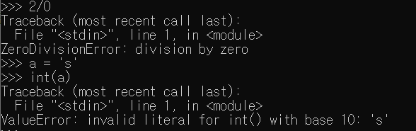 첫 번째 2/0은 ZeroDivisionError(0으로 나눠져서 생기는 에러) exception을 일으키고, 두 번째는 ValueError exception을 일으킨다.