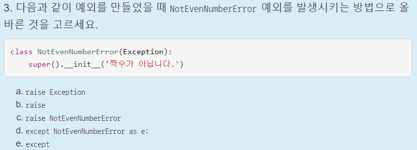 주어진 코드는 NotEvenNumberError라는 사용자 정의 예외를 만들고, 에러 문구를 '짝수가 아닙니다.'로 정한다.