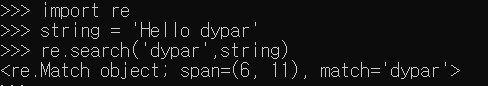 보면 search 역시 SRE_Match 객체를 반환해준다. Match와는 달리 'dypar' 포함 여부도 판단할 수 있는 것을 볼 수 있다.