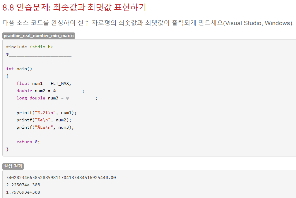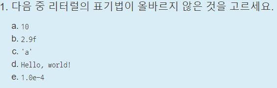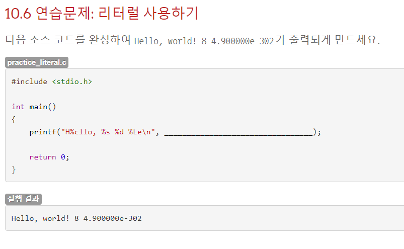 리터럴을 사용해서 Hello, world! 8 4.900000e-302가 출력되도록 입력하면 될 것 같다.