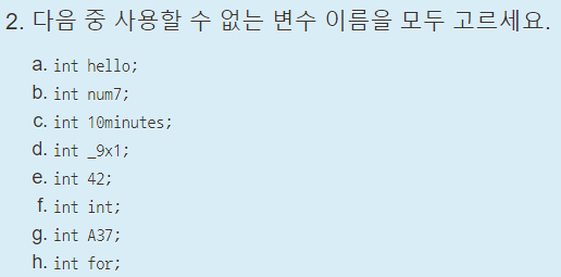 사용할 수 없는 변수 이름은 _를 제외한 특수문자들이나 c언어에서 사용되는 키워드, 변수이름이 숫자로 시작 등이다.