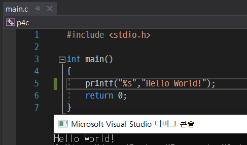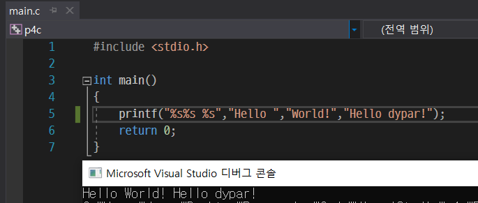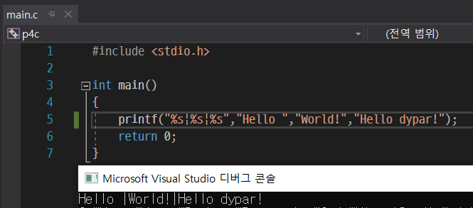 printf에 %s를 넣어주고 ','후 문자열 값을 넣어주니, %s 부분이 지정한 Hello World!로 바뀌어서 출력되는 것을 볼 수 있다.