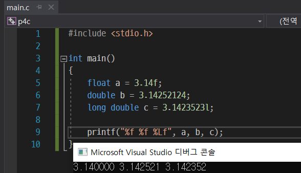실수 입력도 정수형과 똑같은 방식이다. 그냥 서식 지정자를 실수에 맞게 %f나 %L로 써주면 끝이다.