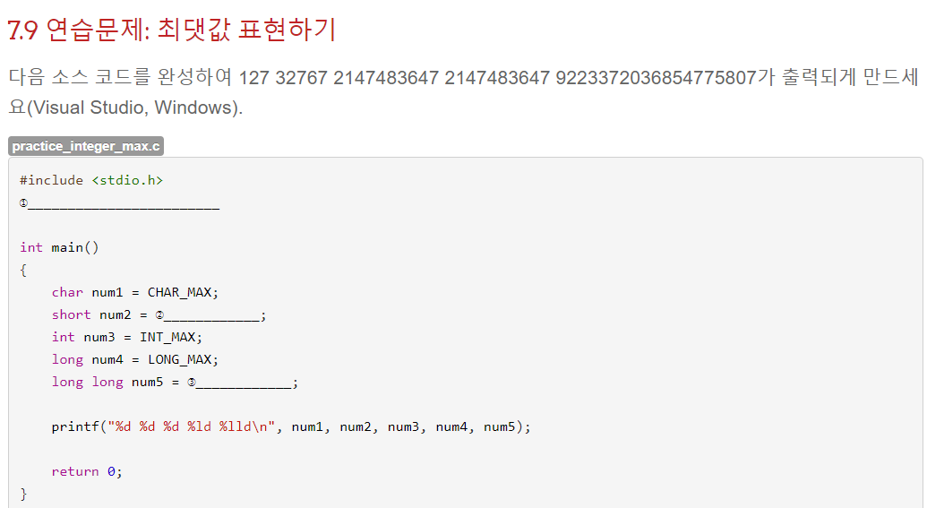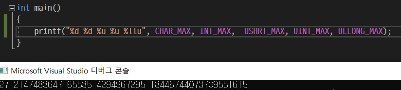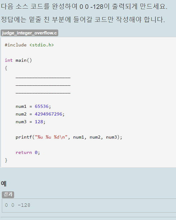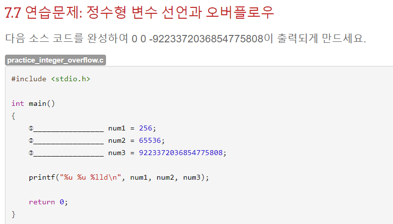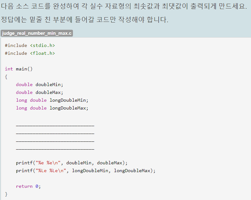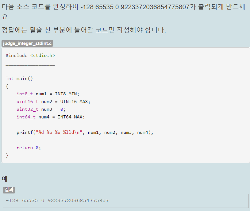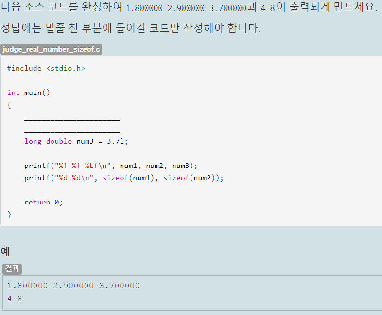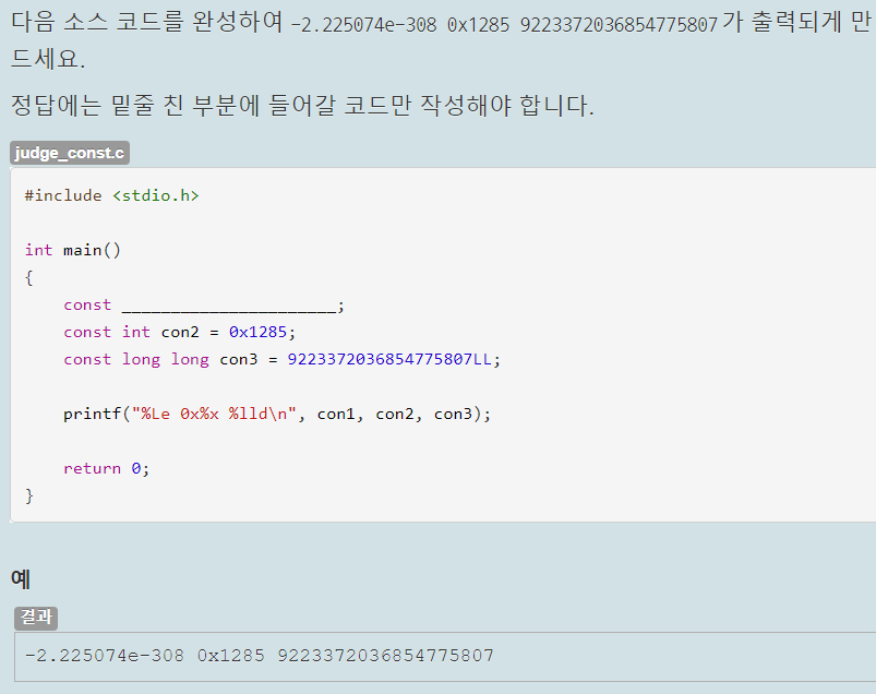 자료형은 주어진 printf문의 서식 지정자를 보고 정해줬다. con1은 %llu로 출력하므로 unsigned long long형으로 자료형을 작성했고, con2는 %f이므로 float형으로 만들었다. con3는 %c이므로 char형으로 문자 하나를 작은 따음표로 감싸서 넣었다.