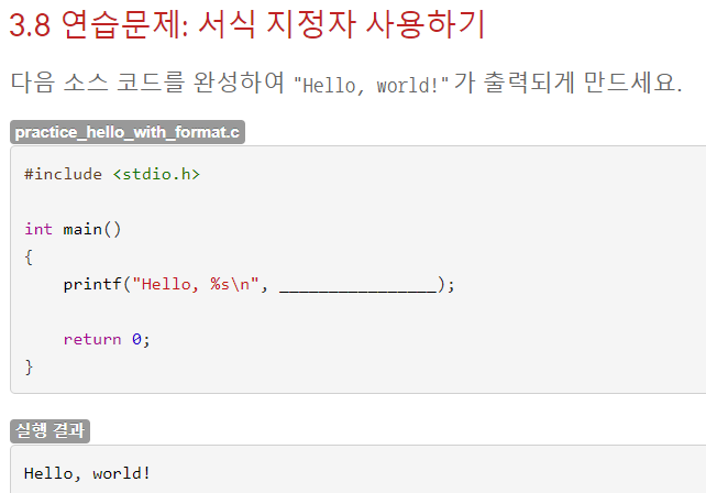 Hello, world!를 출력하는 것이 목적이다. printf 함수 안을 보면 이미 Hello, %s\n이 주어져 있다. %s 부분이 world!가 들어갈 자리므로 %s에 world!가 들어가게끔 쉼표 뒤에 작성해주면 될 것 같다.