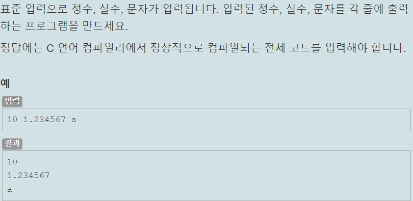 정수, 실수, 문자가 공백을 기준으로 구분되서 입력된다. 이 입력된 값들을 각 줄에 출력하는 것이 목적이다. 1, 2행에서 define과 stdio.h를 include해 scanf, printf를 사용할 수 있게끔 해주고 %d, %f, %c로 정수, 실수, 문자를 scanf로 입력 받아 printf 함수로 출력하면 될 것 같다.