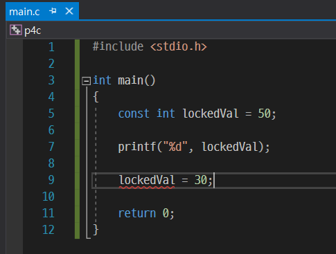 상수는 const로만 선언하고 값의 사용은 일반 변수와 같다. 값만 변경 못하는 일반 변수라고 생각하면 된다. 위처럼 각 자료형에 맞는 서식 지정자로 상수의 값을 출력 시킬 수 있다. 9행에서 일부러 상수의 값을 변경하려고 시도했는데, 사진처럼 오류가 보여진다. 값의 변경이 안되는 것을 볼 수 있다.
