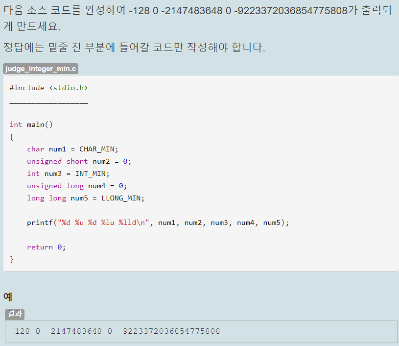 Hello, world! 76 -2147483647 4.528172가 출력되도록 하는 것이 목적이다. 주어진 printf문에 리터럴 값만 추가하면 된다.