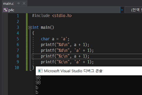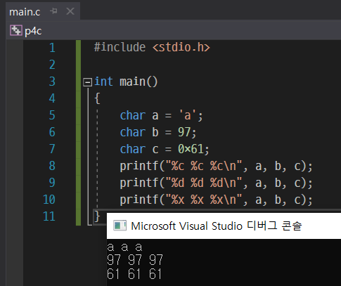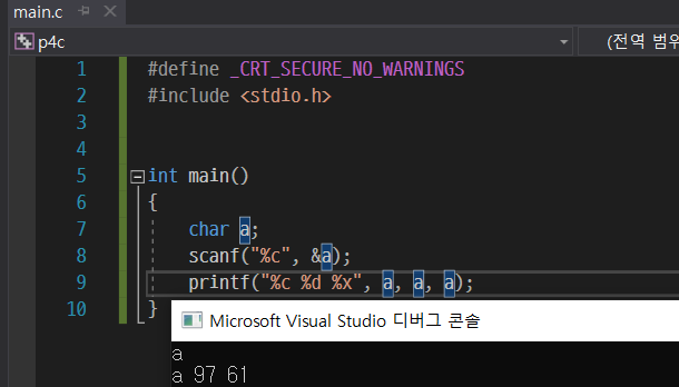 문자 입력도 마찬가지다. 서식만 %c로 바꿔주면 끝이다.