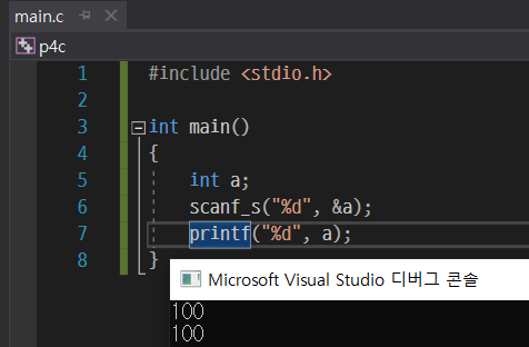 5행에서 입력 값을 저장할 int형 a 변수를 선언하고 6행에서 %d형으로 받은 값을 a의 주소에 저장해준다. 그리고 7행에서 a의 값을 출력한다.