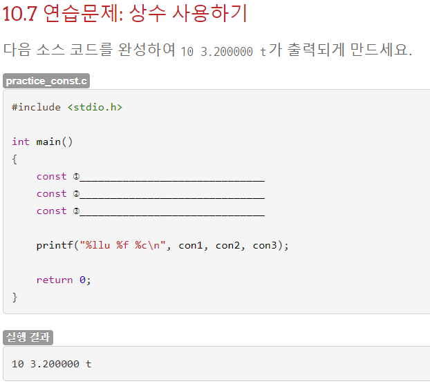 상수형으로 con1, con2, con3을 만들고 각각 값을 10, 3.2, 't'를 넣어주는 것이 목적이다. 각 들어갈 값에 따른 자료형을 잘 정해주면 될 것 같다.