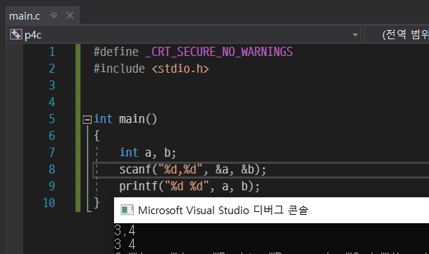 위 사진처럼 서식 지정자를 원하는 식으로 바꾸면 입력도 그에 맞게 된다. %d,%d를 써줘서 입력 값을 공백이 아닌 콤마로 구분져서 입력 받게 작성하니, 입력시 ,로 구분해서 여러 값을 입력할 수 있다.