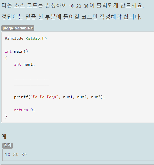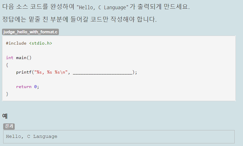 Hello, C Language를 출력시키는 것이 목적이다. 서식으로 %s, %s %\n이 지정되어 있으므로 첫 번째 %s에는 'Hello', 두 번째 %s에는 'C', 세 번째 %s에는 Language가 들어가면 될 것 같다.