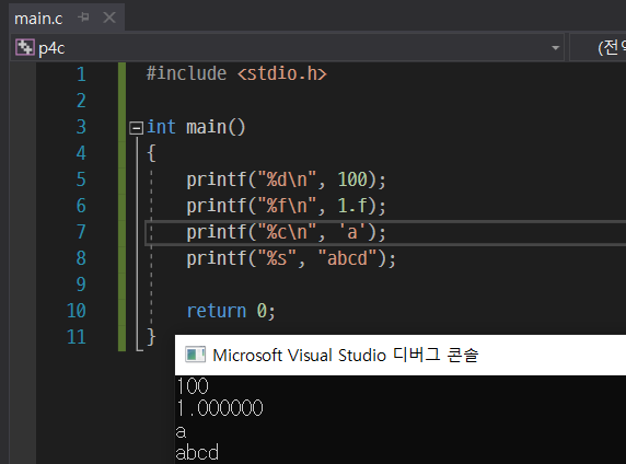 또한 뒤에 정리한 내용이지만 서식 지정자를 사용해 줄 때는 printf("<서식>", <값1>, <값2>...) 이런식으로 작성하면 된다.