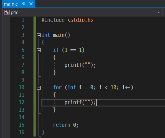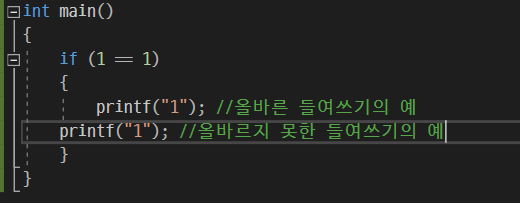 들여쓰기는 파이썬과 달리 c언어에서는 문법적인 의미는 없다. 들여쓰기를 안해줘도 상관이 없지만, 코드 블럭을 구분하는 등 들여쓰기를 해주면 가독성이 높아지기 때문에 해주는 것이 좋다.