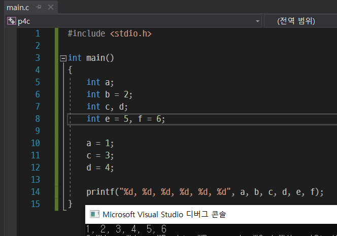 5행은 변수를 선언만 하고 10행에서 값을 할당해 준다. 6행은 선언과 동시에 값 2를 변수에 할당해 준다. 7행은 같은 자료형인 변수 두 개를 동시에 선언을 해주고 11, 12행을 통해 값을 할당해 준다. 8행은 변수 두 개를 동시에 선언을 해줌과 동시에 각각 값을 할당해 준다.